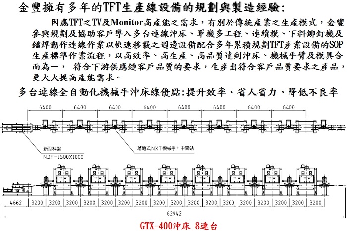 金豐於2001年參與國內第一條TFT產業110 TON ×6連臺配合機械手臂生產,為同業最先最早自動化生產系統。